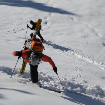 Der Sonntag bringt Sie auf eine genussreiche, leichte Skitour mit Unterricht in Ausrüstung, Felle richtig aufkleben, Aufstiegsspur anlegen, kraftsparendes und blasenfreies Gehen, Spitzkehre für steile Abschnitte, einteilen der Kräfte, Handhabung des LVS und natürlich nochmals intensiver Tiefschneeunterricht während der Abfahrt.
